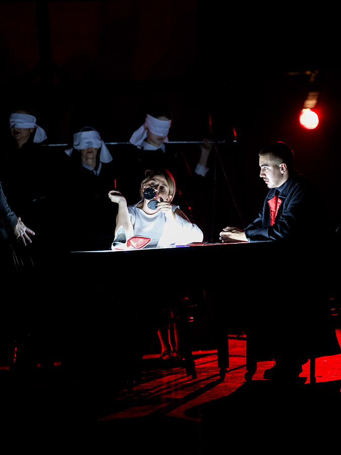 У позоришту, као и у животу, поставља се питање – ко обликује судбине? Да ли је човек творац сопствене приче или је марионета у рукама невидљивих друштвених сила? У Крлежином делу “У агонији”, ово питање поприма посебну тежину, јер се пред нама одвија драма у којој се појединац суочава с непробојном структуром лицемерја, друштвених норми и моралних компромиса. Представа ,, Агонија Лауре Ленбах” није само прича о једној љубави, једном браку или једној смрти – она је сецирање друштва које не прашта слабост и које обликује појединце према сопственим потребама, често их ломећи у том процесу. Још је Мишел Фуко (Michel Foucault) истицао да моћ не почива само у институцијама, већ да прожима целокупну друштвену структуру, ослањајући се на норме, правила и дискурсе. У “Агoнији Лауре Ленбах”, моћ није конкретна сила, већ флуидна игра интереса, хијерархијских односа и друштвених очекивања која не дозвољавају побуну. Ленбах, пијани официр прошлих ратова, оличење је света који пропада, али и даље вуче конце у рукама; Иван, адвокат и рационални прагматик, делује као неко ко је изградио сопствену судбину, али у стварности је тек продужена рука манипулативног система који је научио да савршено игра по правилима; Лаура, у почетку немоћна и спутана, на крају бива приморана да прихвати закон јачег, јер у свету у којем су сви вукови, јагањци не преживљавају. Ово друштво је, дакле, машина за млевење људског меса (људскости) која меље оне који се не уклопе. “Највећи злочини у историји нису чињени из страсти, већ из послушности” – речи Хане Арент (Hannah Arendt) које савршено осликавају ово окружење. Појединци у овом свету не морају нужно бити зли, али постају део система који захтева подређеност и игра се судбинама, увек оправдавајући сопствене поступке вишим циљевима или друштвеним нормама. Позориште и живот су слични – оба захтевају игру улога. Социолог Ервинг Гофман (Erving Goffman) у својој теорији драматургије истиче да људи у друштву функционишу као глумци на сцени, прилагођавајући своје понашање очекивањима публике, ликови носе маске које одговарају њиховим друштвеним позицијама, али ниједна од тих маски није трајна. Иван није само успешан адвокат и поштован грађанин, већ и хладан манипулатор који препознаје како да користи друштвена правила да би остварио сопствене циљеве. Његова приврженост Лаури никада не надмашује његову потребу да сачува углед и статус. Мадлена Петровна, новинарка, не трага за истином већ за наративом који ће најбоље продати. Чак и опатица, оличење духовног ауторитета, носи маску која крије ниске страсти и потребу за контролом. Свака од ових фигура је део система у којем се лаж и обмана не сматрају моралним падом, већ вештином преживљавања. Лаура је у почетку слика жене какву друштво очекује – супруга, мученица, жртва. Али кроз ток драме, њено сазревање је заправо процес освешћивања да правила која су јој наметнута не постоје да би је заштитила, већ да би је контролисала. Када схвати да је истина релативна и да морал не постоји изван моћи, Лаура се преображава у нешто што друштво не може да контролише – у фигуру која узима правду у своје руке. Овај тренутак је кључан јер се не дешава из хира, већ из нужности. “Када те дуго терају да будеш немоћан, пре или касније ћеш постати опасан” – ово је логика друштвених механизама који рађају оне против којих