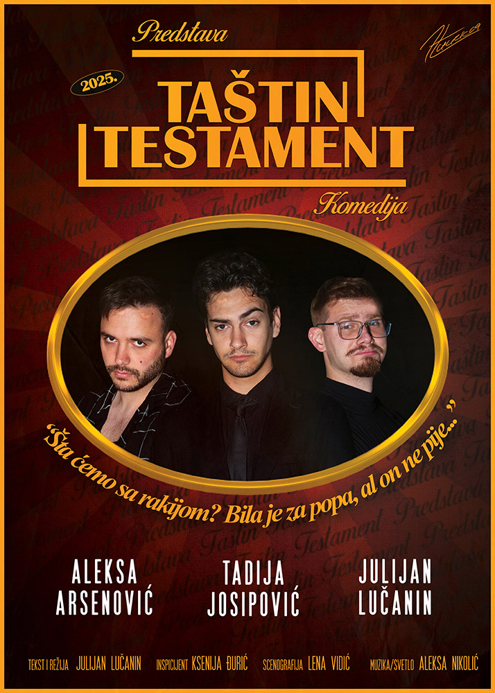 „Таштин Тестамент“ је комедија о свима нама, о неспоразумима које упорно негујемо, тајнама које делимо сами са собом, и о томе колико је тешко, а и смешно, бити искрен када је то заиста потребно. У центру ове приче нису ни тестамент, ни наследство, већ људи са манама, невољама, врлинама и лудостима. И баш у том хаосу, у свакодневним промашајима и покушајима да будемо бољи, крије се права вредност. Наслеђе које не иде преко суда, него преко душе.